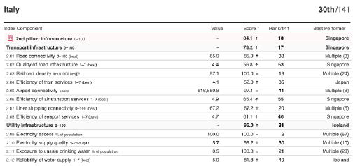 Il primo riguarda la dotazione e l'adeguatezza infrastrutturale. Un recentereportdel World Economic Forum (2020) colloca l'Italia al 18° posto su 141 Stati considerati, con un miglioramento di nove posizioni rispetto all'indagine del 2017-2018, ma con un marcato distacco dai maggiori paesi europei (Paesi Bassi 2i, Spagna 7ª, Germania 8ª, Francia 9ª)21.