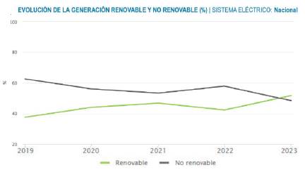 Los datos anteriores confirman que se está avanzando en el ámbito de la transición energética porque un poco antes de 2023 el porcentaje de energías renovables comienza a ser superior al de energías no renovables, como se aprecia en la figura 2.