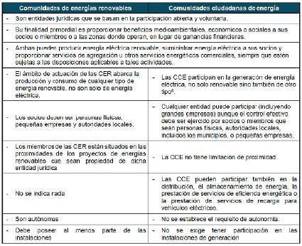 La regulación proyectada en España sobre las comunidades energéticas locales efectúa la trasposición de las directivas (UE) 2018/2001 y 2019/944, y se concibe como una regulación de mínimos, que establece las condiciones básicas de los dos tipos de comunidades admitidos, y que pueden ser completadas con la normativa propia de la fórmula jurídica adoptada y por los estatutos que la propia comunidad puede aprobar a título particular. Las características básicas y diferenciales de los dos tipos de comunidad energética previstos se exponen en la tabla 1.