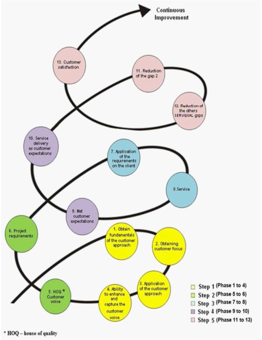 Step 1 - The first step consists of the following phases: I. Getting the basics of the customer approach (Lewis, 1989); II. Customer focus (Bitner, 1990, Cronin & Taylor, 1992, Kim & Kim, 1995); III - Application of the customer approach (Parasuraman et al., 1985); IV. Ability to improve and capture the voice of the customer (Bouranta et al., 2009; Pelit et al., 2011). These phases are the first cycle of the structural approach shown in Figure 1. The first step is to apply the SERVQUAL scale. The original SERVQUAL questionnaire was adapted to evaluate the customer expectations regarding the service delivery with customer focus vision (Smith, 2009). This questionnaire has 35 questions, derived from the 22 original SERVQUAL questions and 13 questions based on the QUESC model to better understand the needs of the invited customers in order to provide specific measures of the service, it should identify which dimension better meets the customer’s needs. Each dimension of perceived service is measured using a five-point Likert scale: "How much do you agree or disagree with these statements?" with options ranging from (1) strongly disagree to (5) strongly agree.