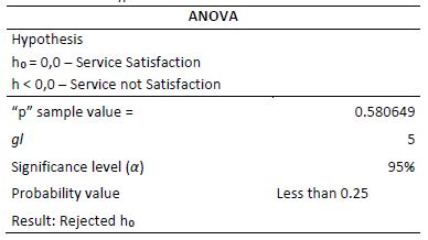 In this sample, q2 has the value of 16.496, and gl of 5. By convention, was adopted the cut-off point or the significant level (α) for a p-value is 0.05, A value of 11.07 was obtained for the. As observed the q2 > , the test rejected the h0, the association between then exist, because the customer analyzed the quality service as a global phenomenon. Each dimension can influence another to create the perception about the service experience for the customer.