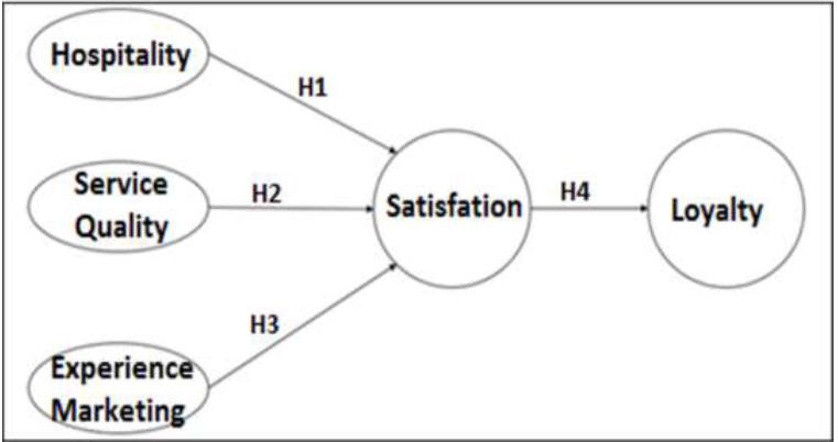 The proposed model with its respective variables are presented in Figure 1. There are three dependent constructs (Service quality, Hospitality, and Experience marketing) and the independent variable is Satisfaction. The model also includes Loyalty as a result of customer satisfaction.
