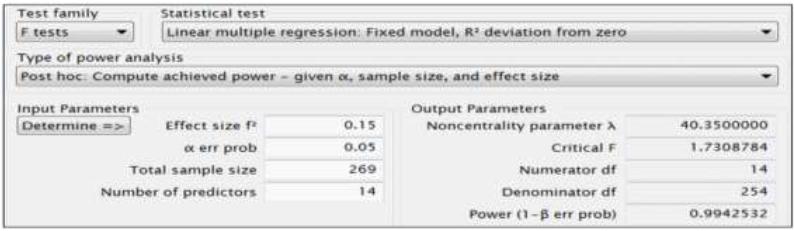 The post hoc test to analyze the statistical power based on the values used in this study (ES= 0.15, α-value= 0.05, N= 269 and predictors= 14) attained the value of 0.9942, in other words, surpassing the assumed value (0.80), as in Figure 3. (Cohen, 1977; Erdfelder, Faul, & Buchner, 1996; Hair et al., 2010)