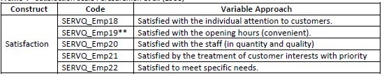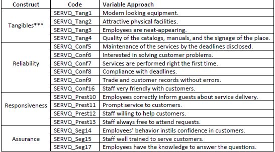 by Parasuraman, Zeithaml, & Berry (1988), as presented in Frame 2, though the tangible construct was excluded from this study, since the variables had a weight of less than 0.50 after the first processing of the structural equation modeling with SmartPLS 3 software, as suggested by Hair, Black, Babin, Anderson, and Tatham (2010). This procedure is detailed in item 3.