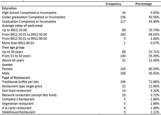 At the end of the period of data collection, we observed that more than 307 consumers participated in the study, though only 269 questionnaires were validated, since some of the participants did not regularly visit restaurants and so they were excluded.