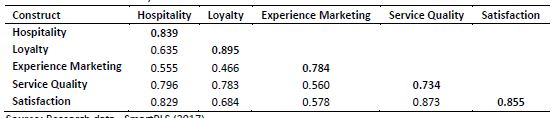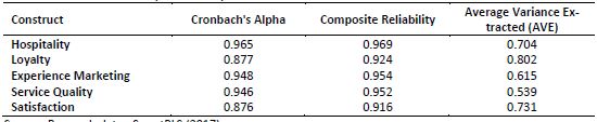According to Hair et al. (2010, p. 100) “Cronbach's Alpha is a measure of reliability that ranges from 0 to 1, with values of 0.60 to 0.70 deemed the lower limit of acceptability”. For this study, we used the acceptance criterion in relation to Cronbach's Alpha minimum 0.70. As presented in Table 2, the values of all constructs were acceptable based on this criterion.