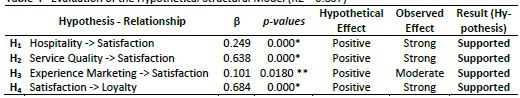 There are indications that Hypothesis H1 (the perception that hospitality in restaurants influences guest satisfaction) is supported by the results in this study (Table 3), so we can claim that guests associate satisfaction to the service provided and to aspects of hospitality, confirming the studies by Teng and Chang (2013).