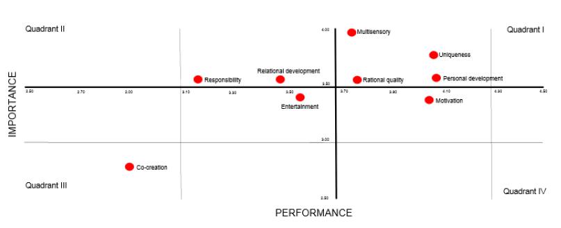 The dimensions of entertainment and co-creation are positioned in the third quadrant, which indicates that these variables are not considered by tourists as very important and at the same time, they have not been highly achieved in Quito either.