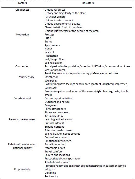 The traveler experience in destination as a multidimensional construct, has gained the attention of numerous experts who have gradually added variables to be considered as part of it. Thus, to the early proposal of Otto and Ritchie (1996) that raise the variables: hedonism, involvement, peace of mind, and recognition; others have been added such as: love, joy, positive surprise (Hosany & Gilbert, 2010); involvement, timelessness, happiness, pleasure, relaxation, stimulation, spontaneity, meaningfulness, sense of separation, adventure, personal relevance, novelty, local culture, escaping pressure and intellectual cultivation (Kim, Ritchie & McCormick, 2010); freedom of choice, fantasy, spontaneity, special entertainment, sense of self-realization (Nash & Smith, 1991, cited by Rivera M., 2012); adverse feelings (Kim, 2014); authentic characteristics of the destination and cultural heritage (Cetin & Bilgihan, 2015), among others. However, in this same line, the approach of Pulido and Navarro (2014) proposes an integrated set of factors and indicators to measure the tourist's experience in the destination, which include social, emotional, sensory, creative, relational, cognitive, and personal factors. The nine factors that measure the tourist experience from the point of view of these authors, can be seen in Table 1.