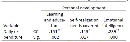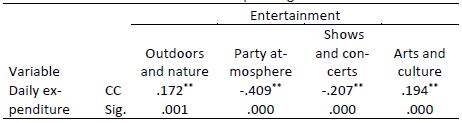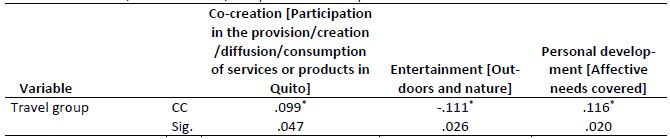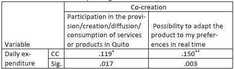 Similarly, it is found that daily expenditure is influential on the assessment given by tourists to co-creation; entertainment (obtained based on nature and outdoors, party atmosphere, shows and concerts, and art and culture); personal development (based on learning and education, needs for self-fulfillment, and emotional intelligence); social interaction; rational quality (appreciated in terms of affordable prices, comfort, ease of finding places, public transportation, service attributes, and professionalism in customer service); as well as in the practice of values such as discipline, integrity and reciprocity. Values of Spearman coefficient are shown in Tables 9 through 13 below.