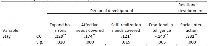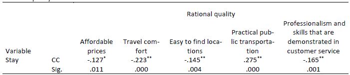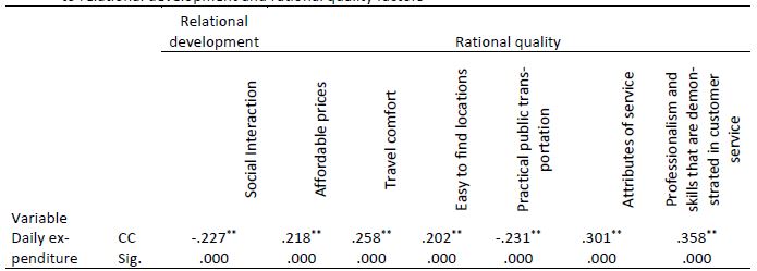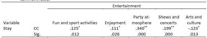 The variable "stay" influences aspects such as: sports and recreational activities, fun, party atmosphere, and arts and culture within the entertainment factor; expand horizons, needs for affection, self-fulfillment and emotional intelligence, within the factor of personal development; social interaction; and, accessible prices, comfort, ease of finding places, practical public transport, and professionalism in customer service, within the rational quality factor. The detail of the calculated values for the Spearman coefficient can be seen in Tables 14 to 16.