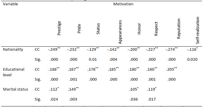 In addition, study shows that depending on tourist nationality, motive that drives them to tell their experiences differs between prestige, pride, status, honor, respect, and self-realization. Likewise, educational level influences these reasons except self-realization, where no association between variables was found. The marital status of tourists, basically seems to influence four of the motivations studied: prestige, pride, honor, and respect. The calculated values of the Spearman coefficient can be seen in Table 17.