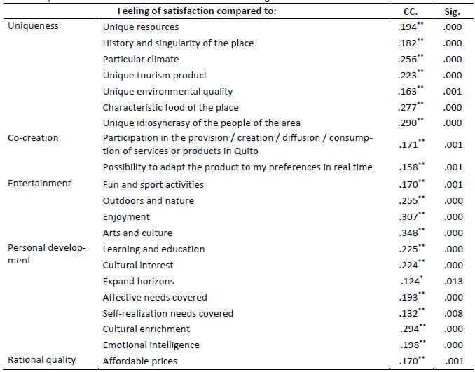 Finally, the correlation analysis between the total set of indicators and the indicator "satisfaction sensation", shows that the uniqueness attributes of destination constitute influential elements at the level of: unique resources, history and singularity of the place, particular climate, unique tourist products, quality of the unique environment and idiosyncrasy of the local people. Results also confirm that co-creation influences the sense of satisfaction as long as tourist had partaken on provision, creation, diffusion and/or consumption of services and products; and, have had the possibility of adapting product to their preferences in real time.