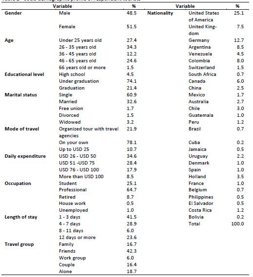 The profile of foreign tourists shows diversity of nationalities, the most frequent of which are the following: American (25.1%), German (12.7%), Argentine (8.5%), Colombian (8%), British (7.5%) and Canadian (6%). Among profile features that also stand out for higher frequency are: age (about 34,3% of tourist are between 26 and 35 years old), educational level (about 74,1% of them have a university degree), marital status (about 60.9% of them are single), occupation (about 64.7% are in the professional field), travel organization (about 78.1% of tourists have planned their own trips), average daily cost (between USD 16 and 50) and average stay (between 1 and 3 days mostly). A detailed profile is shown in Table 2.