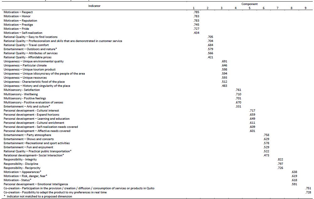 In this stage of the research, 9 factors that define the dimensions of tourist experience, adopted from Pulido and Navarro (2014), were confirmed through Confirmatory Factor Analysis. The Varimax rotation with Kaiser normalization was applied to the correlation matrix. Results show that at least 84.4% of the proposed indicators are agglomerated in the proposed factors, confirming empirically their relevance in the context of Quito to the foreign tourist segment. Thus, of all the items raised by the authors mentioned, only 7 are not matched in the proposed dimensions. The calculated values are presented in Table 3.