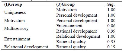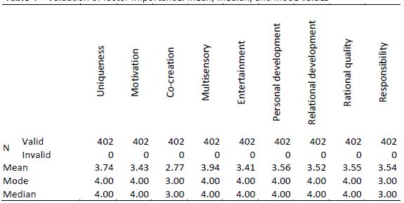Importance given by surveyed tourists to factors/dimensions shows different values as can be seen in Table 4, where the mean, mode, and median values are presented. As can be seen, dimension valued with the highest score was multisensory while the lowest score valued was co-creation.