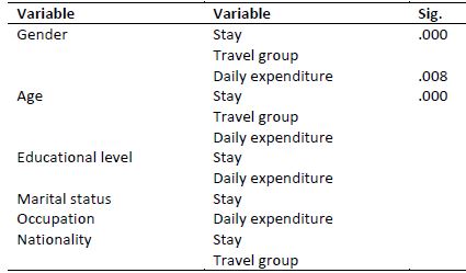 In this set, the following variables stood out: "age" and "educational level" because they influence the greatest number of dimensions (seven factors/dimensions); followed by "marital status", "daily expenditure", and "travel mode" (five dimensions); and "occupation", and "stay" (four dimensions). Finally, the variable "gender" influences a single dimension. It should be noted that for the dimension "special and unique attributes of the destination" the cited variables do not show dependence.
