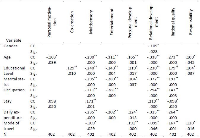 Results from Spearman correlation coefficient confirms there is a set of variables that show greater influence on valuation of importance of the dimensions under study. These are: gender, age, educational level, marital status, occupation, stay, daily expenditure, and mode of travel.