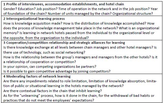 The interviews were conducted in November 2016, all registered through an audio recorder, with the prior authorization of the participants. The data collection instrument (interview script) consisted of 21 questions organized into 4 thematic sections: 1) profile of the interviewees, accommo-dation establishments, and hotel chain; 2) the process of interorganizational learning; 3) the cooperation/competition relationship and the strategic partnerships for learning; and 4) the moderating factors of network learning.