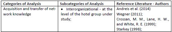 The interviews were previously scheduled, and all were carried out at Unit II of the chain where the Group's administrative office is located. After data collection and transcription of interviews, the data was organized according to categories of analysis: 1) knowledge acquisition and conveyance between the chain’s hotels and other hotels in the city; 2) organizational memory; 3) coopera-tion/competition relationship; 4) strategic partnerships; and 5) the interorganizational learning’s moderating elements, which are divided into three subcategories, as can be seen in Table 2.