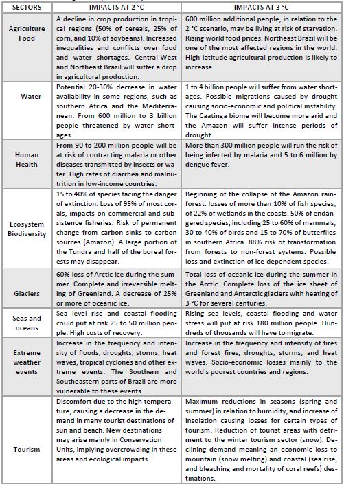 The main scenarios used in climate change research are emissions, climate, environmental, and vulnerability (Koumrouyan, 2010). In Table 1 these scenarios are identified according to Stern (2006); UNWTO (2007); Moreno (2010); Grimm et al.; IPCC (2013); and the Brazilian Panel on Climate Change - PBMC (2014), trends adopted as a reference, projections with global climatic changes from two moderate scenarios of temperature rise (+ 2 °C and + 3 °C), and incorporating the effects of the changes in different sectors including tourism.