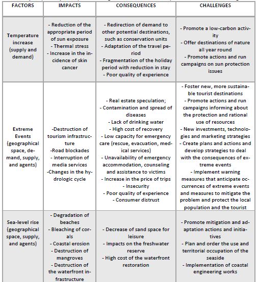 In this context, we can observe the challenges tourism faces from the possible impacts of climate change. Economic, through new investments, technologies, and marketing strategies; environmental, with the protection and rational use of resources; social, promoting the reduction of poverty, the reduction of tourist vulnerability, ensuring physical security of the receiving community and tourists, in the event of an extreme climatic event; policy, promoting mitigation and adaptation actions and initiatives and; spatial, with proper planning and land use.