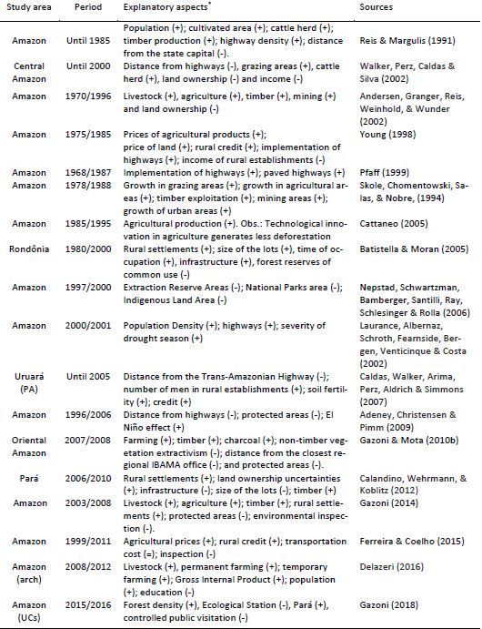 The main explanatory aspects of deforestation already identified in the Amazon are: 1) population - demographic density, urban and rural population, urban migration and growth; 2) agriculture and livestock - agricultural production, soybean cultivation, cattle herds and pastures and land ownership; 3) access policies - highway density, implementation and paving of roads, distance from highways; 4) the market - prices of agricultural products, land price and transportation cost; 5) vegetal extractivism - logging, charcoal and non-timber extraction; 6) environmental policies - protected areas and environmental monitoring; 7) the biophysical environment - forest stock, soil fertility, rainfall and the El Niño3 effect; 8) mining - distance from mineral production centers; 9) rural settlements - number of families settled and lot size; 10) other aspects - rural credit, public development projects and public land grabbing.