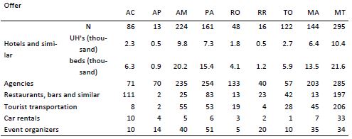Table 1 highlights the tourism facilities and services that were registered at the Ministry of Tourism (MTur) on December 31, 2014 in the nine states that involve the Amazon. The state with the largest offer of accommodation is Mato Grosso, with 21.6 thousand registered beds, or 24.3% of the total. The second largest offer of beds is in the state of Amazonas. There are 20.2 thousand beds, 22.7% of the regional offer. Pará holds another significant portion of the offer, with 15.4 thousand beds (17.3%). In addition to these, Maranhão offers 13.5 thousand beds (15.2%), Acre 6.3 thousand beds (7.1%), Tocantins 5.9 thousand beds (6.6%), Rondônia 4,100 beds (4.6%), Roraima has 1.2 thousand beds (1.3%), and Amapá has 859 beds, only 0.9% of the regional offer registered (Brasil, 2015). The lodging offer is the main indicator of spatial distribution of regional tourist demand. Of course, these numbers are only indicators, since the number of facilities in operation is much larger than the number of companies registered.