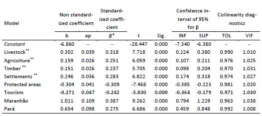 For the estimation of the model some spatial rates were transformed with the natural logarithm. This was because these variables presented strong asymmetry to the right. With the procedure, the series acquired normal behavior, considering the multivariate analysis. The results show that deforestation occurred in the period 2015-2016 in the micro-regions of the Amazon biome can be explained, among other possibilities, by eight variables: 1) the number of heads of cattle; 2) the area harvested in temporary and permanent crops; 3) the quantity of timber produced; 4) the number of families living in rural settlements; 5) the extension of protected areas; 6) the number of beds in lodging; 7) the location in the state of Pará and the state of Maranhão. The pace of deforestation increases as cattle, agriculture, logging, and rural settlements increase. On the other hand, the results suggest that the rate of deforestation decreases as the territorial extension of protected areas (Conservation Units and Indigenous Lands) increases and when tourism increases, there is no distinction as to the form of tourism practiced. Of course, an efficient management of the socio-environmental aspects of tourism, especially at the local level, is important. In addition, the results suggest that if the micro-region is in the states of Pará or Maranhão, the rate of deforestation tends to be much higher.