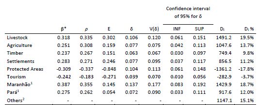 These results reinforce the conclusions reached by Reis and Margulis (1991) and by Gazoni (2014) about cattle livestock; by Cattaneo (2005) and by Young (1998) about agriculture; by Skole et al. (1994) and by Gazoni and Mota (2010b) about timber extraction; and by Batistella and Moran (2005) and Caldas et al. (2007) about rural settlements. The protected areas corroborate the results of Adeney, Christensen and Pimm (2009) and Nepstad et al. (2006). Besides, the important presence of the dichotomous variables for the states of Maranhão and Pará is not new. There have been many occurrences in recent years related to environmental management in these states (Luíse, 2011; Linhares Jr., 2014). Tourism, however, was not found in any robust study for the Amazon. It is suggested that this variable should be included to help explain regional deforestation in future studies for this purpose.