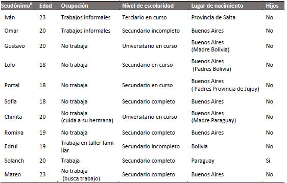 In this manner, together with the process of observation, a biographical focus was developed which involved “reclaiming” and recording the experiences of a selected group of young people over the course of time, with the final aim of formulating, through a series of interviews, a cohesive biographical story (Leclerc-Olive, 2009; Di Leo & Camarotti, 2013; 2015). The construction of these biographical narratives was made possible through a series of semi-structured interviews which, as dialogic instances, allow to examine the way these young people constructed their experiences, as well as their relationships, conflictive situations, and other changes in their daily lives (Souza Minayo, 2007).