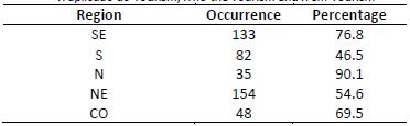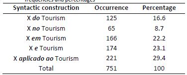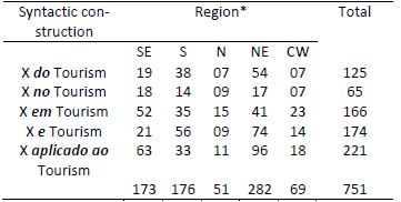 When analyzing the occurrences of the syntactic constructions X aplicado ao Tourism, X no Tourism, and X em Tourism and their respective percentages, by region, considering the semantic approximation between them, we observe that three of the regions present values higher than 60 per cent in the total of the 751 denominations, as shown in Table 3.