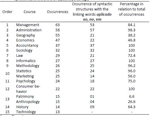 The frequencies and percentages, from this analytical perspective, draw our attention to the mentioned implied meanings of the preponderant understanding of tourism as an "activity" and on the one-way looking at other areas in relation to tourism. A similar situation occurs when we examine the courses with the 15 highest occurrences of the syntactic constructions using the linking words aplicado ao , no , and em , as shown in Table 4.