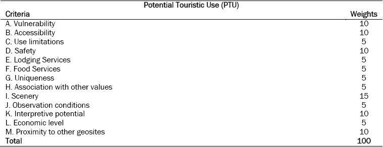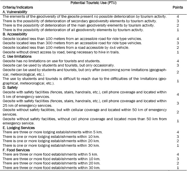 Each of the criteria was subdivided into four sub-criteria that were assigned 1 to 4 points, and for PEU and PTU, score 1 corresponded to low possibility of use and grade 4 corresponded to high possibility of use. The quantification of Brilha (2015) was designed and elaborated for educational and tourist use, but since this search focuses on tourist use, it was decided not to use the PEU criteria. And for the PTU, some adaptations were made to the criteria proposed by Brilha (2015), considering the scale of the study area.