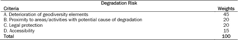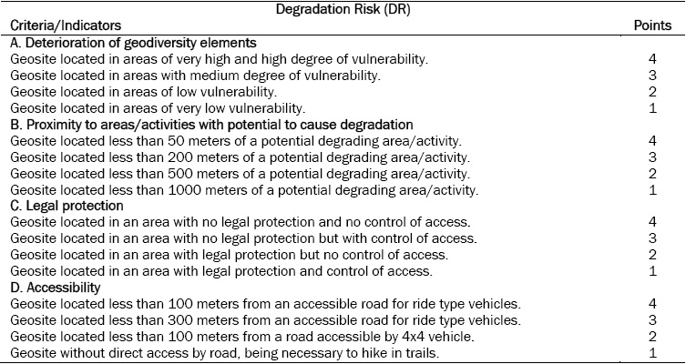 For the evaluation and quantification of degradation risk (DR), Brilha (2015) proposes five criteria: deterioration of geological elements, proximity to areas/activities with potential to cause degradation, legal protection, accessibility, and density of population.
