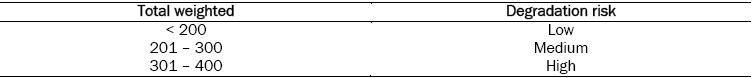 The values obtained in the quantification of the degradation risk ranges from 180 to 300. The sites were assessed in relation to anthropic and natural threats. The absolute and weighted values of the sites are shown in Table 7.
