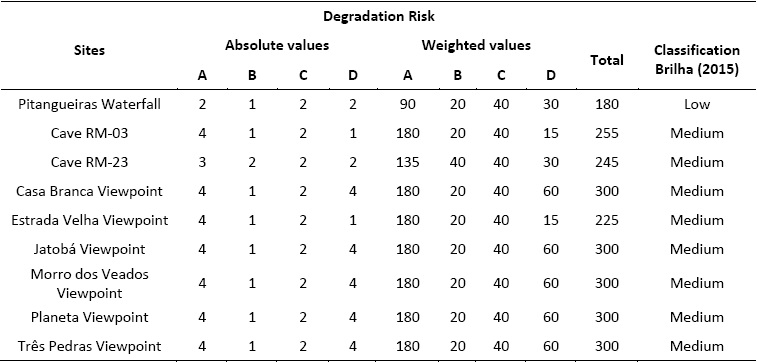 From Table 7 it is possible to observe that the geosites presented a medium degradation risk, with values ranging from 255 to 300. This factor is a result of the location of these sites in areas that presented high index of environmental vulnerability (A), receiving scores of 4 or 3, only the Pitangueiras Waterfall received a lower score, with 2 points.