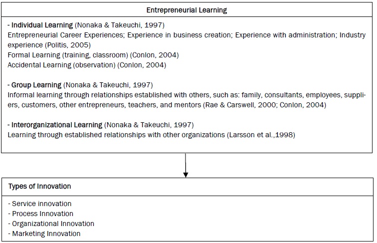 Thus, the present study attempts to fill this gap by analyzing how small and medium sized entrepreneurs of the city of Aracaju learn to innovate, and what types of innovation are adopted in these companies. To achieve this goal, we propose a conceptual model, taking as reference the type of innovation adopted by the Organization for Economic Cooperation and Development (OCDE, 2005), which considers that innovations adopted by a company can be classified into four types: service innovation, process innovation, organizational innovation, and marketing innovation. In addition, this model is based on the concept of interorganizational learning by Larsson, Bengtsson, Henriksson and Sparks (1998), the type of learning adopted by Conlon (2004), and the dimensions of learning models by Nonaka and Takeuchi (1997), Rae and Carswell (2000), and Politis (2005).
