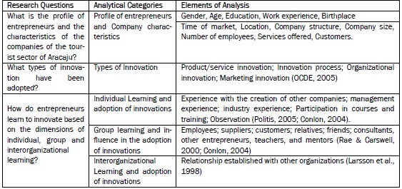 Documentary analysis included documents such as leaflets and folders, as well as information obtained from the study companies’ websites. In addition, we used the technique of direct observation and during interviews we observed the types of innovation implemented in hotels and travel agencies, such as information systems, changes in the structure of the rooms, as well as how services are delivered to customers, including innovations in care, room service, among others. In qualitative studies, since there is no concern with measurement items, the operational definitions are represented by analytical categories, which allow the organization of the elements of analysis grouped by closeness of meaning (Laville & Dionne, 1999). Frame 1 details the analytical categories and the elements of analysis that formed the basis for this study.