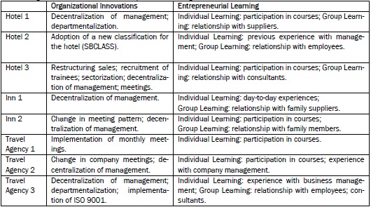 In addition to individual learning, it was possible to verify that there was also the influence of group learning in the introduction of organizational innovations. Entrepreneurs reported that the relationships developed with suppliers, employees, consultants, and family were instrumental in the adoption of organizational innovations, since through these relationships information and knowledge are exchanged, and new ideas are shared. Didier and Lucena (2008) found similar results who, in the study carried out in the tourism sector, found that managers of tourism companies basically learn through relationships established with other individuals.