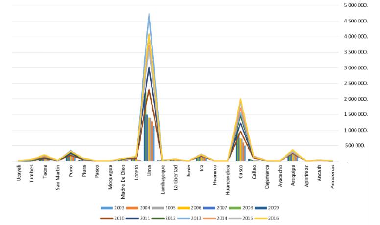 In Peru, this industry generates about 1.1 million jobs and contributes 3.3% of GDP (CAMARA, 2018) where in 2017 the GDP amounted to a value of 157,744 million dollars where the tourism sector represents 3.2% of this total being above the sectors of fisheries, aquaculture, electricity, and natural gas; and showing a growth of 1.4% compared to 2016 (BCRP, 2018), which makes the tourism sector one of its main economic activities due to the fact that same year, 4 million 32 thousand 339 international tourists arrived in the country, representing an 8% growth in incoming tourism compared to 2016 (MINCETUR, 2017a), where the main countries that visited Peru in 2017 were: Chile ( 27%), the United States (15%), Venezuela (5%), Ecuador (7%), Colombia (5%), and Argentina (5%) making a market share of 69% of arrivals to the country (GESTION, 2017). The main entry points to the country were: Jorge Chavez International Airport (58%), Tacna (23%), Tumbes (9%), and Puno (5%) (MINCETUR, 2017b). It is estimated that foreign currency revenues generated by incoming tourism in Peru, during the year 2017, reached 4,574 million dollars, representing a growth of 6% in relation to 2016 (MINCETUR, 2017b).