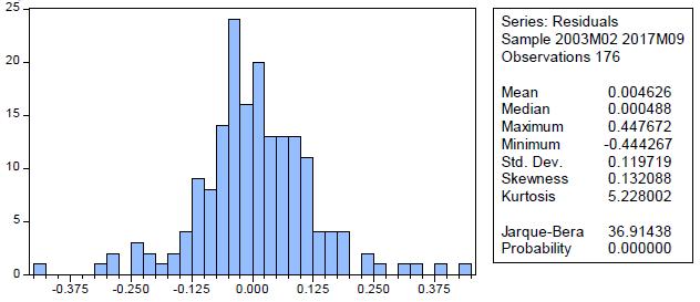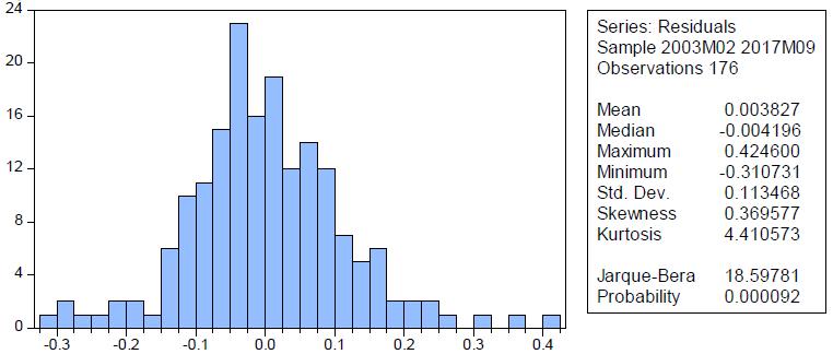 Normality. The Jarque-Bera statistic developed by Jarque & Bera (1980, 1981, 1987) is a goodness-of-fit test to verify if the study data have asymmetry or kurtosis in a normal distribution, i.e. if the residuals behave as a normal function. In Figure 8, the results of this statistic are shown, in this case the value of the probability equal to zero indicates the rejection of the hypothesis of a normal distribution. Since the value of the Jarque-Bera statistic is greater than the reference value of tables (approximately a value of 6) and the probability is less than =5%, the residuals of the model are not shared as a normal function. However, following the central theorem of the limit, it can be concluded that when working larger samples than the current one, it would guarantee that the errors behave as an asymptotically normal function (Laurente & Poma, 2016).