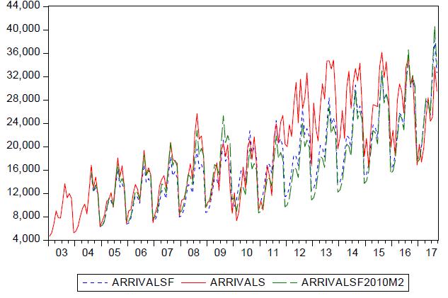 After the diagnostic test performed on the SARIMA (6, 1, 24) (1, 0, 1)12 model, the forecasting of the study variable is performed (Box & Jenkins, 1976). The results are shown in Figure 11 where the variable arrivals is the original variable, arrivalsf is the forecast with the ARIMA model selected and the variable arrivalsf2010m2 is the forecast with the ARIMA model selected with intervention in 2010m2.