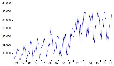For the identification, Figure 3 shows the evolution of international arrivals in the department of Puno for the years 2003 to 2017, clearly showing a growth and gives evidence to the presence of non-stationarity in mean and variance.