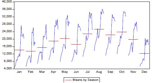 Figure 4 shows that each year arrivals of tourists to Puno have an annual seasonal cycle because they begin to rise from the month of February to May, falling slightly in the month of June recovering in July and reaching its peak in August falling in September recovering slightly in October and falling to a minimum in the month of December. This gives evidence for a 12-month ARIMA seasonal model.