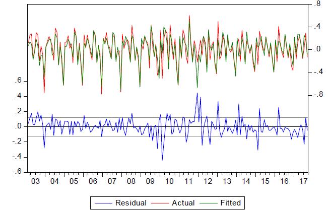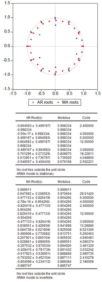 For the diagnosis of the SARIMA (6, 1, 24) (1, 0, 1)12 model the Figure 5 shows that the roots of all the AR and MA are less than 1, this shows that the ARIMA model is stable as well as the mistakes. Also, Figure 6 shows the current values, forecasting values and residuals of the SARIMA (6, 1, 24) (1, 0, 1)12 model.
