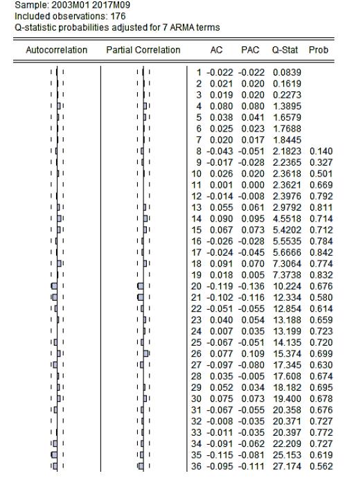 In Figure 9, the correlogram of the residuals of the SARIMA (6, 1, 24) (1, 0, 1)12 model with intervention in 2010m2 analyzed by the Q statistic of Ljung-Box (Ljung & Box, 1978) is shown , determines that there is an absence of autocorrelation in the residuals, that is, the behavior resembles that of a white noise because all the coefficients fall within the confidence interval at 95% confidence, in addition to all the p-values associated with the statistical Ljung-Box for each delay (p-value) are large enough to not reject the null hypothesis that all coefficients are zero