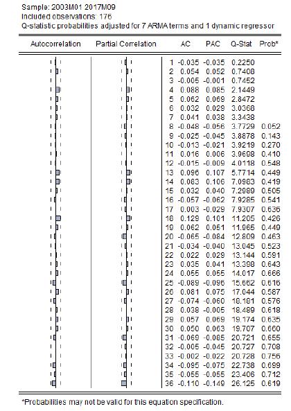 Likewise, from Table 5 it is shown that the SARIMA (6, 1, 24) (1, 0, 1)12 model with intervention in 2010m2, does not present problems of autocorrelation since the Durbin-Watson (DW) statistic is found around 2. Consequently, the residues of the SARIMA (6, 1, 24) (1, 0, 1)12 model with intervention in 2010m2 are uncorrelated.
