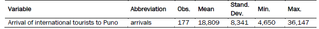 The data in logarithms of the arrivals of international tourists to Puno are used to model tourism.