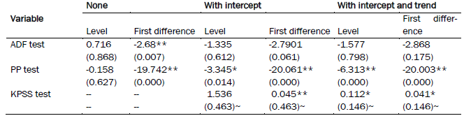 As a first step, it is determined if the series is stationary, for this purpose it uses the unit root ADF tests of Dickey & Fuller (1979), PP by Phillips & Perron (1988) and KPSS by Kwiatkowski, Phillips, Schmidt, & Shin (1992) those shown in Table 2.